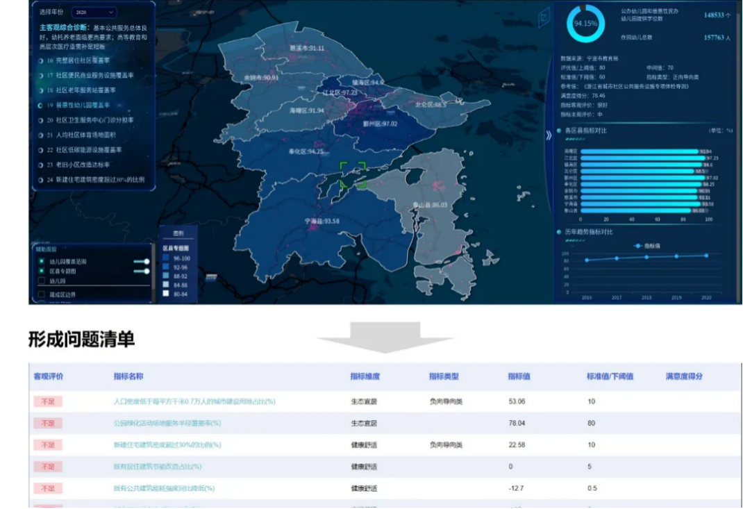 寧波作為全國城市體檢樣本城市,創(chuàng)新體檢工作方法,推動(dòng)體檢成果應(yīng)用成為體檢工作的關(guān)鍵。現(xiàn)階段寧波已建立起“內(nèi)容構(gòu)建-數(shù)據(jù)采集-計(jì)算評(píng)價(jià)-診斷建議-行動(dòng)落實(shí)”的智慧評(píng)估體系,以“體征采集—體征分析—問題診斷—場景應(yīng)用”為評(píng)估信息平臺(tái)建設(shè)的主脈絡(luò),構(gòu)建“1+3+X”的功能框架,逐步形成了以“診斷分析、監(jiān)測預(yù)警、輔助決策”為核心的智慧評(píng)估閉環(huán)。評(píng)估平臺(tái)以客觀指標(biāo)為基礎(chǔ)、居民問卷調(diào)查為補(bǔ)充,精準(zhǔn)查找居住環(huán)境、社區(qū)服務(wù)存在的問題,匯集而成社區(qū)養(yǎng)老服務(wù)設(shè)施覆蓋率、社區(qū)衛(wèi)生設(shè)施覆蓋率、社區(qū)低碳能源設(shè)施覆蓋率、公交站覆蓋社區(qū)占比、人均避難場所有效避難面積等16類成果數(shù)據(jù)和分析結(jié)果,綜合反應(yīng)城市發(fā)展、人居環(huán)境的短板,為民政、衛(wèi)健、交通、應(yīng)急等多部門分類提供城市體檢中所遇到的具體問題、核心內(nèi)容并制定相應(yīng)解決措施,從而加快城市體檢成果。
