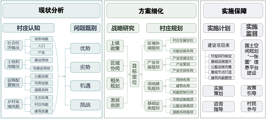 規(guī)劃可分為現(xiàn)狀分析、方案細(xì)化和實(shí)施保障三大部分,分別從明確需求、建設(shè)引導(dǎo)和落地實(shí)踐等方面,保障規(guī)劃的有序推進(jìn)落實(shí)和村莊健康向上發(fā)展。
