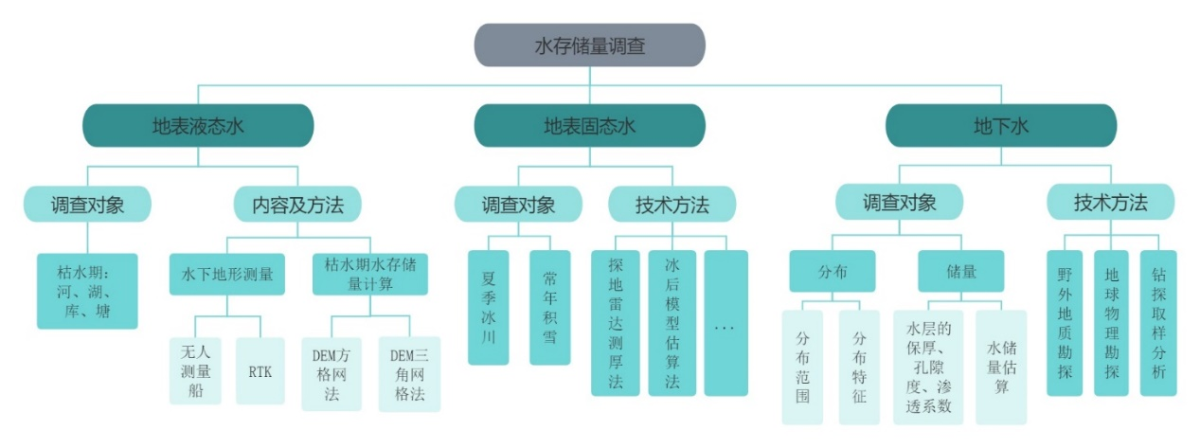 對地表液態(tài)水儲(chǔ)存量、地表固態(tài)水儲(chǔ)存量和地下水儲(chǔ)存量進(jìn)行調(diào)查,調(diào)查對象、內(nèi)容和技術(shù)方法如下圖所示。