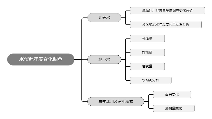 對水資源主要指標(biāo)開展年度變化調(diào)查評價(jià),包括湖泊、水庫和重點(diǎn)江河水體儲(chǔ)存年度變化量,地下水儲(chǔ)存年度變化量,冰川及常年積雪年度面積變化和消融量,河湖庫塘水面面積年度變化等,具體指標(biāo)如下圖所示。