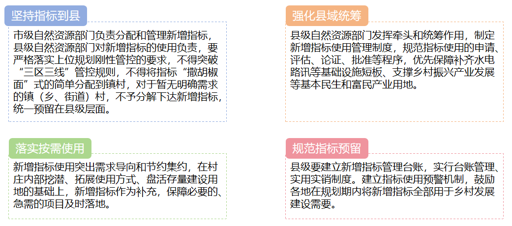 為切實(shí)加強(qiáng)國(guó)土空間規(guī)劃實(shí)施管理,嚴(yán)格實(shí)施國(guó)土空間用途管制,精準(zhǔn)發(fā)揮新增農(nóng)村建設(shè)用地指標(biāo)對(duì)鄉(xiāng)村振興支撐保障作用。陜西省自然資源廳于2024年12月下發(fā)了《關(guān)于規(guī)范國(guó)土空間規(guī)劃中新增農(nóng)村建設(shè)用地指標(biāo)使用的指導(dǎo)意見(jiàn)》(試行),對(duì)新增農(nóng)村建設(shè)用地指標(biāo)使用提出了指導(dǎo)意見(jiàn):
