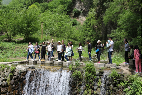 6日早上,前一天還是黃沙漫天的天空已然蔚藍(lán)透徹,8:30分準(zhǔn)時(shí)由公司出發(fā),一路歡歌到達(dá)目的地,在郁郁蔥蔥的水苑山莊吃過具有鄉(xiāng)野特色的午飯后,興奮的同事們沿著幽靜的狐貍溝溯流而上直達(dá)仙女瀑布,瀑布水流潺潺,妖嬈雋秀,沁人心脾。