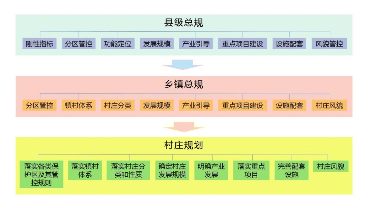 “縣—鎮(zhèn)—村”三級規(guī)劃傳導(dǎo)將各類剛性指標逐級分解,定位分區(qū)等逐步細化落實,確保規(guī)劃能有效的實施,推進全域協(xié)調(diào)有序發(fā)展。